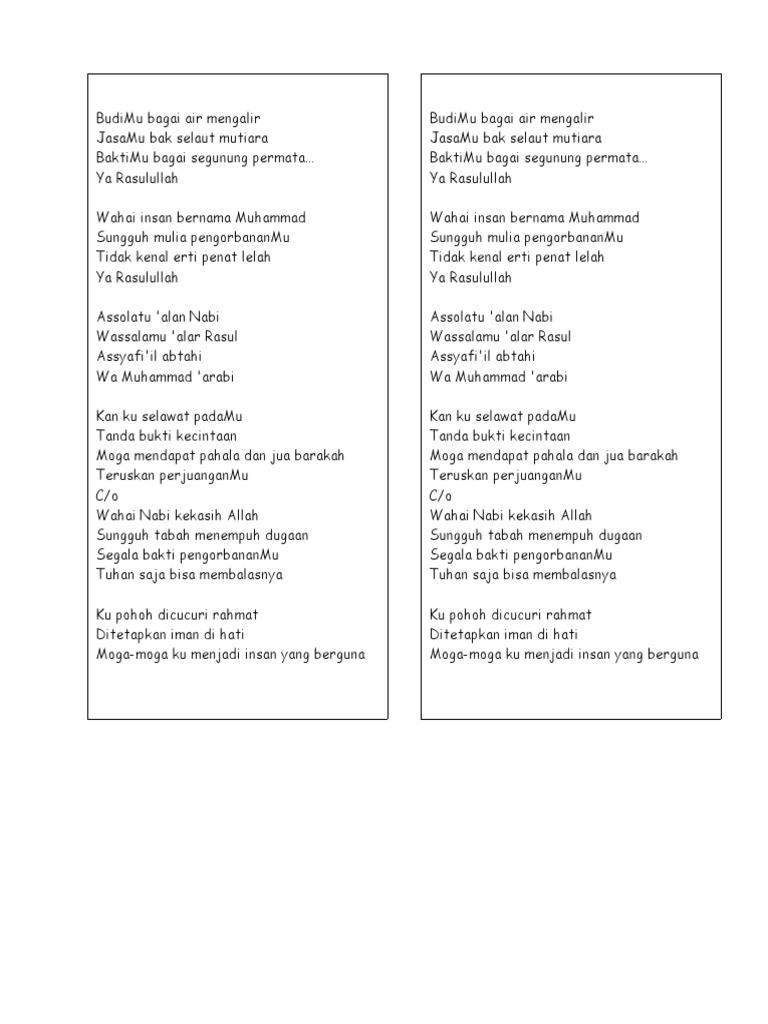 Di dalam hati manusia. Iman adalah mutiara Di dalam hati manusia Yang meyakini Allah Maha Esa Maha Kuasa Tanpamu iman bagaimanalah Merasa diri hamba padaNya Tanpamu iman bagaimanalah Menjadi hamba Allah yang bertaqwa Iman tak dapat diwarisi Dari seorang ayah yang bertaqwa Ia tak dapat dijual-beli Ia. Syair-syair lagu yang penuh pujian pada Allah SWT dan Rasulullah Muhammad SAW renungan hingga hadist gubahan kelompok ini dilantunkan di berbagai tempat.